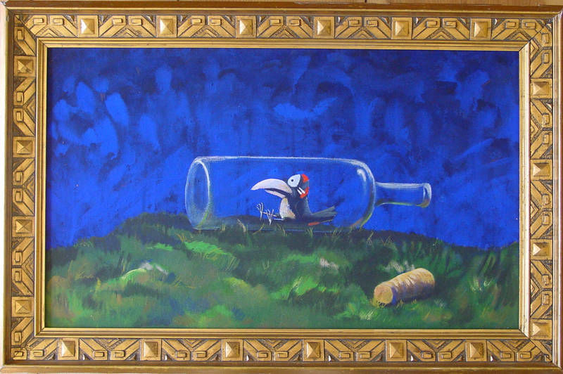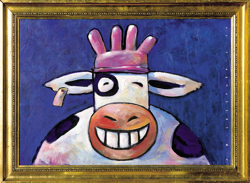 PRESSETEXT: Leistners Bilder handeln von lustigen Tierchen auf königsblauem Hintergrund; gestapelte Schweine, komische Vögel und ulkige Hühner, die ratlos neben viel zu großen Eiern hocken. Sein munterer Tierpark erspart den Gang auf den Bauernhof und verspricht ein ergötzliches Erlebnis. Nicht nur für trübe Herbsttage. Goldgerahmt entfalten seine strahlendblauen Tierbilder eine charmante Leichtigkeit und verleiten jeden Betrachter zum verzauberten Schmunzeln. Er ist Grenzgänger zwischen den Künsten. Leistner: „Durchs Zeichnen wird die Welt nicht besser, aber bunter.“ Er erweist sich als paradoxer Meister sanfter Ironie und beißenden Humors” Und so scheint er seinen Platz zwischen dem Bilderbuchautor Helme Heine und dem begnadeten Zeichner Michael Sowa gefunden zu haben, den er meisterlich ausfüllt. Seine Bilder sind mal zum verlieben, mal zum Lachen, mal ironisch, mal bissig, aber immer eins: herzerfrischend. „Ich beglücke gern das schöne Geschlecht! ...nein im Ernst: über 80 Prozent meiner Käufer sind Frauen, die sich was „Gutes” gönnen wollen.“ Das meint der verschmitzte fünfvierzigjährige Wahlberliner augenzwinkernd. Einst in Kiel, wo alles seinen Anfang nahm, lebte er in einer kleinen Wohnung inmitten seiner Kunst, tyrannisiert von einem verrückten Vermieter. Um sich seelisch Luft zu verschaffen, malte und zeichnete er derart viel, dass er schon bald an die Grenzen seiner Wohnung stieß. Er löste die Lagerprobleme pragmatisch, hängte alles an die Wand, solange, bis kein Millimeter seiner Wände mehr erkennbar war. Dann begannen die Ausstellungen. Er lebte einige Zeit in New York und ihm wurde klar, dass er in einer Metropole leben möchte. So wurde er Berliner. Bis heute lebt und arbeitet der einstige Westfale in der pulsierenden Hauptstadt und erschafft weiterhin mystische blaue Bilder mit schrulligem Humor in goldenen Rahmen. Seine Bilder verbreiten eine angenehme, humorvolle Atmosphäre, verzaubern Räume in denen man sich gern aufhält und eigenen sich perfekt für Ausstellungen in jeder Art. Soll es keine Ausstellung sein, so kann man sich Leistners Bilderzoo auch gern als Druck ins Haus holen. [...]