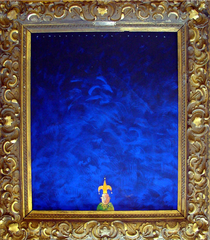 In dieser Ausstellung zeige ich eine Reihe von Comic-ähnlichen Werken, die durch ihre auffällige Farbigkeit und pointierte Schärfe bestechen. Die Bilder, umrahmt von opulenten Goldrahmen, die Teil von meinem Ausstellungskonzept sind, besitzen eine Spannung zwischen edel und satirischer Spitze – das strahlende Ultramarinblau kontrastiert mit den ironischen Motiven, die an den Hofnarr erinnern – lustig, aber mit einer Wahrheit dahinter. Die Titel meiner Arbeiten entfalten eine weitere Dimension, verändern die Wahrnehmung und eröffnen tiefere Bedeutungsebenen. Sie ergänzen die Bilder, stellen Widersprüche auf und regen dazu an, das Offensichtliche zu hinterfragen.